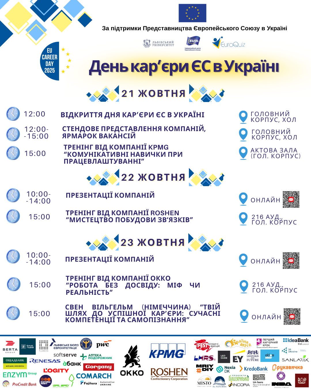 Детальніша інформація на сайті Відділу кар’єрного розвитку та співпраці з бізнесом: http://work.lnu.edu.ua/den-kar-iery-yes-2025/
