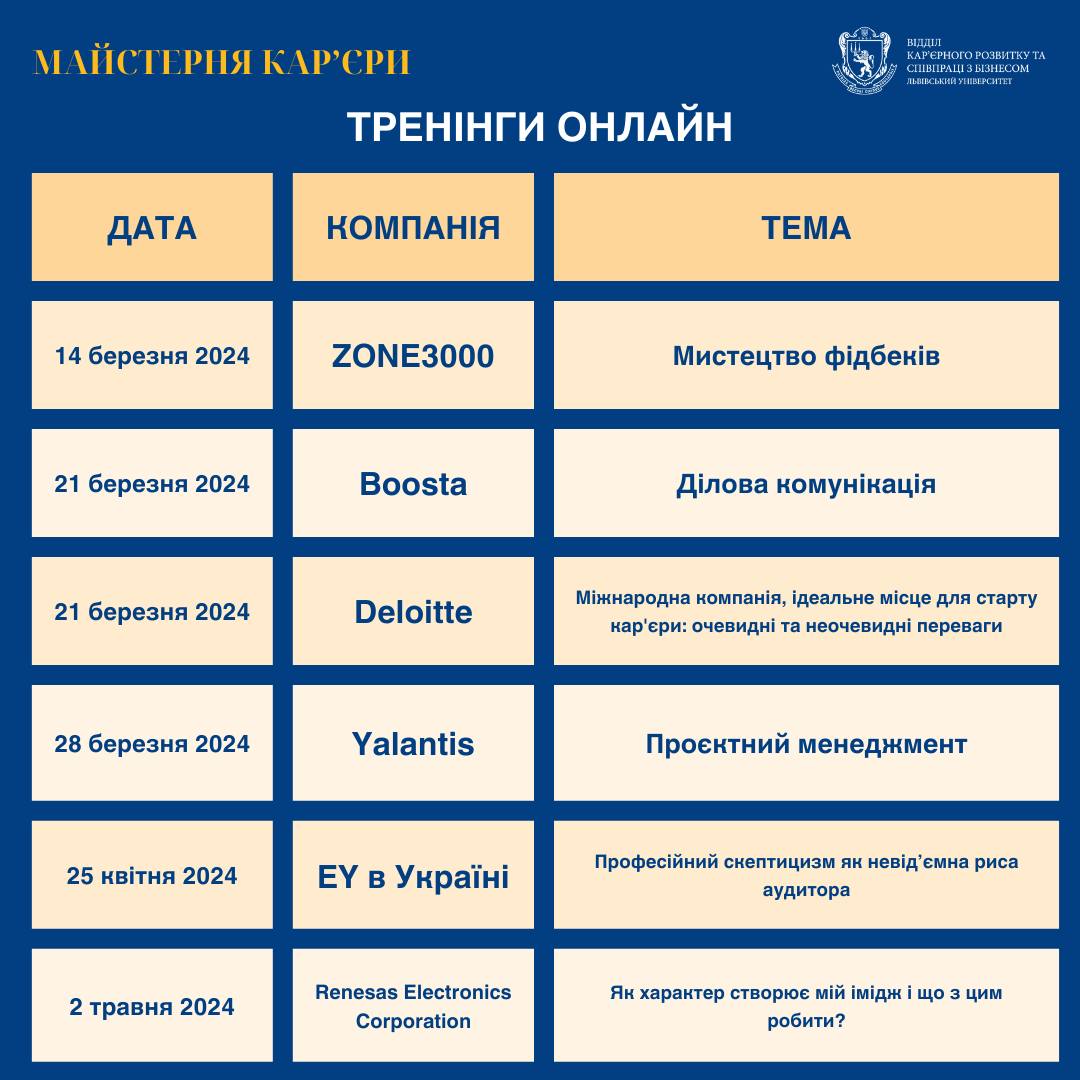 Відділ кар’єрного розвитку та співпраці з бізнесом проводить опитування серед студентів, випускників та викладачів Університету щодо визначення основних напрямків та складання серії тренінгів на весняний семестр з провідними українськими та міжнародними компаніями у рамках проведення “Майстерні кар’єри” та інших заходів для студентів Університету.