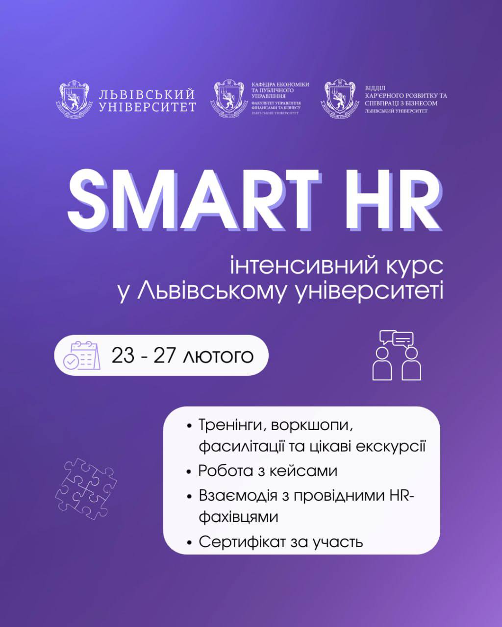 23–27 лютого у Львівському університеті відбудеться вже четвертий інтенсивний курс SMART HR. Організаторами курсу є Відділ кар’єрного розвитку та співпраці з бізнесом та Кафедра економіки та публічного управління Факультету управління фінансами та бізнесу. Співорганізатором курсу є Громадська рада при управлінні персоналом Львівської міської ради та Асоціація HRD міста Львова.